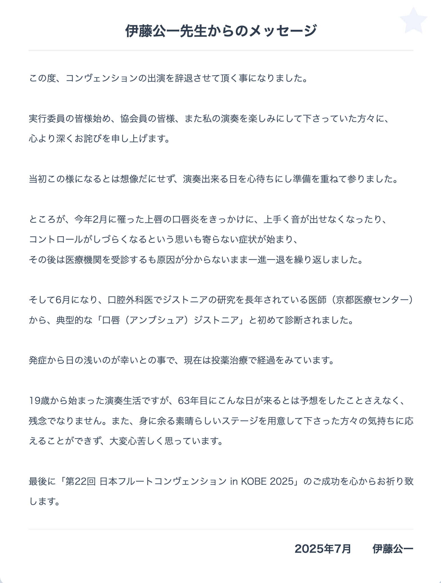 「第22回 日本フルートコンヴェンション in KOBE 2025」のメインゲストの伊藤公一先生が出演できなくなりました。ご本人からのメッセージを掲載させて頂きます。